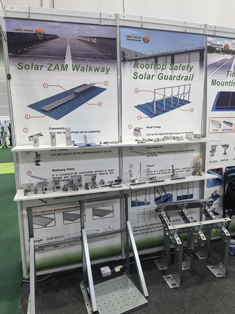 Fuarda kelepçeler, kancalar ve L ayaklar dahil çeşitli çatı aksesuarlarını sergiledik. Müşteriler kurulum ortamlarına göre farklı kombinasyonlar seçebilirler. Renkli kaplamalı çelik kiremitler için kelepçeler veya L ayaklar kullanılırken, seramik karolar için çatı kiremit kancası güneş enerjisi kullanılır. Ayrıca kelepçeleri müşterinin renk kaplı çelik kiremit modeline göre özelleştirebilir veya kancanın kolunu sahadaki kullanıma uyacak şekilde uzatabiliriz.